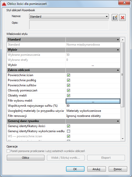 Obliczenie ilości dla pomieszczeń umożliwia określenie, które style umeblowania mają być obliczane.