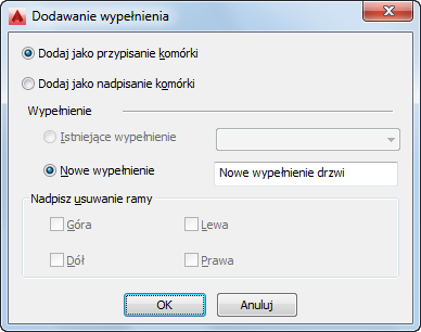 | Dodaj jako nadpisanie komórki, a wstawianym obiektem mają być drzwi lub okno o stylu innym niż istniejący na rysunku, bez usuwania krawędzi ramy otaczającej obiekt | wybierz opcję Nowe wypełnienie, nadaj nazwę obiektowi, a następnie kliknij przycisk OK. |