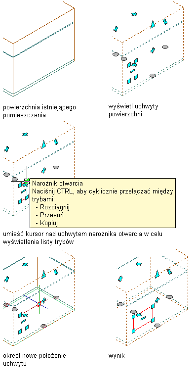 Ta procedura umożliwia rozciągnięcie, przesunięcie lub skopiowanie otworu w powierzchni wyciągniętego pomieszczenia 3D.