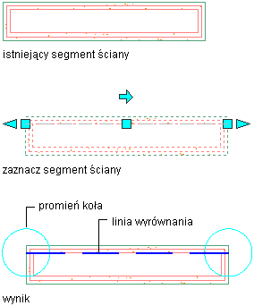 Okrąg czyszczenia znajduje się w punkcie początkowym i punkcie końcowym każdego segmentu ściany. Punkt środkowy każdego okręgu czyszczenia jest punktem początkowym lub końcowym linii wyrównywania ściany.