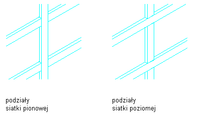 Przy tworzeniu siatki ściany kurtynowej na bazie dwuwymiarowej siatki konstrukcyjnej należy określić kierunek siatki podstawowej umieszczanej w ścianie. W przypadku wybrania opcji kierunku poziomego siatka podstawowa będzie zawierała podziały poziome, przecinające podziały pionowe siatki drugorzędnej. Przy opcji kierunku pionowego siatka podstawowa będzie zawierała podziały pionowe, przecinające podziały poziome siatki drugorzędnej.