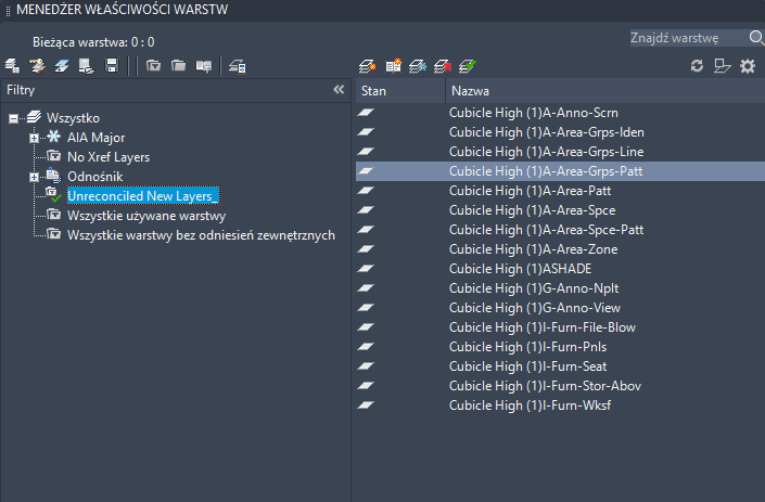 Kliknięcie łącza powoduje otwarcie Menedżera właściwości warstw i automatyczne wybranie filtru Nowe warstwy nieuzgodnione. Wszystkie nowe warstwy, które zostały dodane do rysunku lub dołączonych odniesień zewnętrznych wyświetlane są w formie listy.