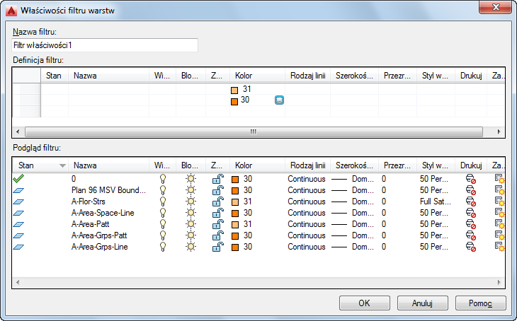 Można także określić więcej niż jeden zestaw kryteriów dla filtru właściwości. Można na przykład utworzyć filtr, który będzie zawierał wszystkie czerwone, zablokowane warstwy i wszystkie niebieskie zablokowane warstwy. W odniesieniu do definicji filtru jest stosowana logika Boole'a i operatory AND/OR, co pozwala określić, które warstwy mają być uwzględniane. Warstwa musi spełniać wszystkie kryteria z jednego wiersza, aby była włączona do filtru. Zgodnie z przykładem warstwa musi być zablokowana i czerwona, aby należeć do filtru. Użycie wielu pozwala definiować inne kryteria. W poniższym przykładzie warstwa musi zostać nadpisana kolorem 30 lub 31.
