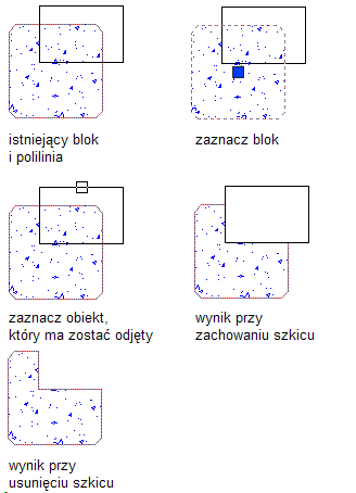 Ta procedura służy do odejmowania wybranej części od szkicu, wielokątów AEC, wyciągniętych elementów bryłowych, pomieszczeń lub bloków zawierających dowolny z tych elementów bez konieczności ponownego rysowania pozostałych komponentów. Aby określić element do odjęcia, można również określić narożniki prostokąta. Część, jaka ma zostać odjęta, może zawierać lub być nakreślona przez linie, polilinie (zamknięte lub otwarte), łuki, okręgi, tekst lub kreskowanie. Jeżeli w wyniku odejmowania usuwana jest część zamkniętej polilinii, polilinia jest ponownie tworzona jako zamknięta. Jeżeli w wyniku odejmowania zamknięta polilinia jest dzielona na połowy, obie części są ponownie tworzone jako oddzielne zamknięte polilinie. Jednak w przypadku, gdy wyniku odejmowania na połowy dzielone jest kreskowanie, kreskowanie pozostaje elementem pojedynczego szkicu, który może zostać wybrany przez kliknięcie dowolnej „części”.