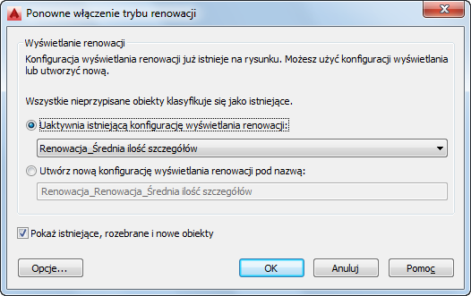 Po ponownym uruchomieniu trybu remontu w uprzednio włączonym rysunku można nadal korzystać z istniejącej konfiguracji wyświetlania remontu lub utworzyć nową.
