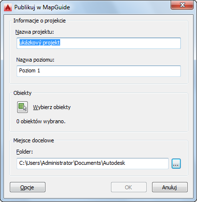 Jeśli rysunek, z którego chcesz publikować dane, jest częścią projektu budynku, w oknie dialogowym Publikuj w MapGuide są wyświetlane nazwa projektu i przypisany poziom wyświetlania.