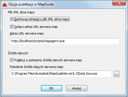 | zachować istniejący plik Map Window XML | wybierz opcję ochrony pliku XML w oknie. Ta opcja zapobiegnie nadpisaniu pliku MWX istniejącego w tym miejscu. Umożliwi to użytkownikowi zachowanie wszystkich zmian wprowadzonych w pliku MWX (wybory źródłowej tabeli danych dodatkowych, właściwości warstw lub schematów) w przypadku aktualizowania lub ponownego publikowania podstawowych danych lub geometrii. |