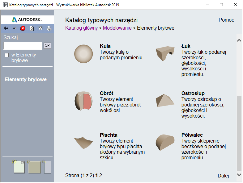 Kategoria katalogu narzędzi może zawierać więcej elementów niż mieści się na stronie. Jeśli kategoria zajmuje wiele stron, w górnej i dolnej części każdej strony wyświetlane są elementy sterowania nawigacją. Kategoria narzędzi elementów bryłowych zajmuje dwie strony elementów bibliotecznych. Można wybrać stronę do wyświetlenia, klikając numer strony lub klikając przyciski Dalej lub Wstecz. (Należy zauważyć, że te elementy sterowania znajdują się także w dolnej części strony.) Można także zmienić liczbę elementów wyświetlanych na stronie Wyszukiwarki bibliotek.