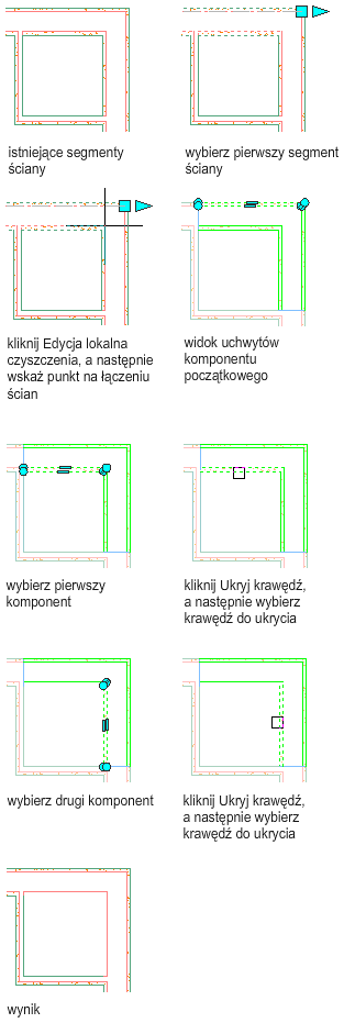 W przykładzie poniżej ukryte zostały krawędzie komponentu ścianki w celu utworzenia warunku narożnika wewnętrznego.