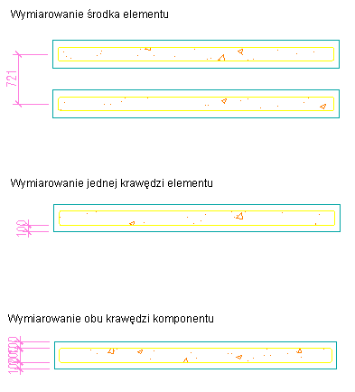 Dostępnych jest wiele różnych opcji wymiarowania pojedynczych komponentów ściany. W stylu ściany można zdefiniować ustawienia wymiarowania dla każdego pojedynczego komponentu ściany. Każdy komponent może być wymiarowany do jednej lub dwóch krawędzi, jak również do środka komponentu. Można również wybrać brak wymiarowania określonego komponentu.