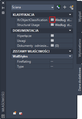 - Na palecie właściwości, na karcie Dane dodatkowe, na panelu Klasyfikacja kliknij opcję IfcObjectClassification i wybierz klasyfikację.