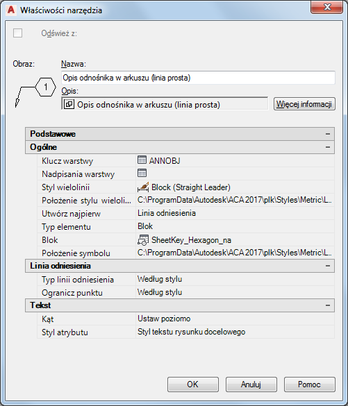 | Styl tabeli | Określa styl tabeli AutoCAD dla legendy opisu odnośnika. Możliwymi wartościami są: Legenda opisów odnośników w odwołaniach, Legenda opisów odnośników w arkuszu i Standard. Jeżeli właściwość nie została określona (--), używany będzie aktualny styl tabeli. |