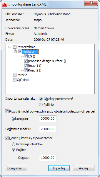 3. W oknie dialogowym Importuj dane LandXML wybierz opcje importowania.