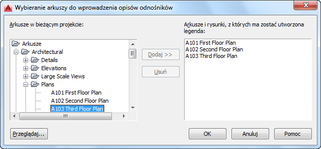 | włączyć wszystkie opisy odnośników z innych arkuszy | kliknij prawym przyciskiem myszy, kliknij polecenie Arkusze, aby wyświetlić okno dialogowe wyboru arkuszy dla legendy opisów odnośników. Lewe okienko zawiera listę arkuszy w aktualnym projekcie. Wybierz arkusza i przesuń je na prawe okienko, klikając Dodaj. Można także kliknąć Przeglądaj, aby odnaleźć i pobrać arkusze z innych projektów lub rysunków, które nie zostały zapisane jako arkusze. Jeżeli prawe okienko zawiera wszystkie rysunku/arkusze, z których chcesz uwzględnić opisy odnośników, kliknij OK. |