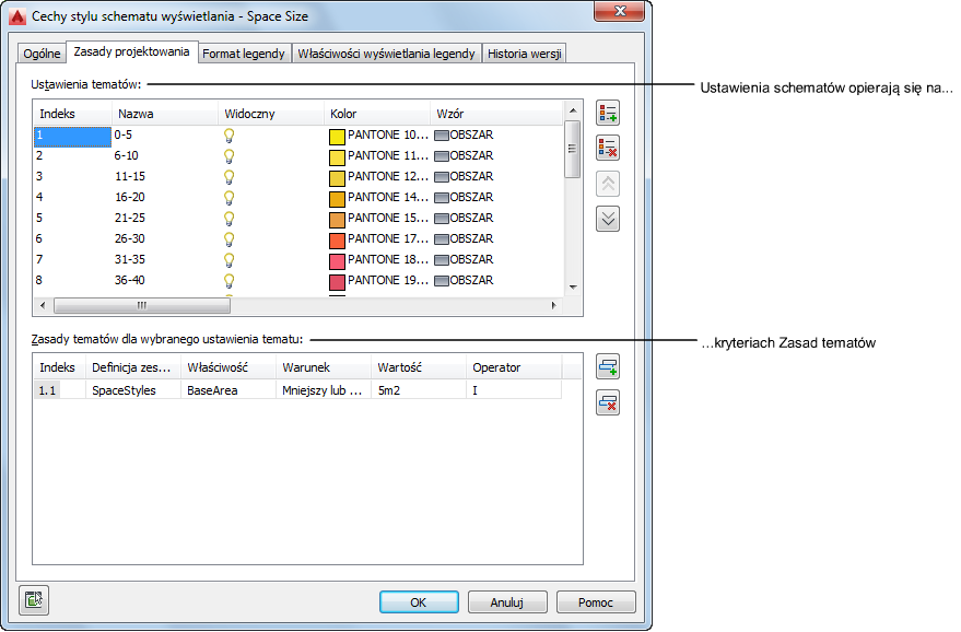 Styl schematów wyświetlania definiuje określony schemat wyświetlania uwzględniający dane niegraficzne na rysunku poprzez zaznaczenie obiektów, które spełniają określone kryteria. Typ zaznaczenia jest kontrolowany przez jedno lub więcej ustawień schematów, a każde z nich określa kolor wypełnienia, kreskowanie i rodzaj linii. Dla każdego ustawienia schematu istnieją dwie lub więcej zasady schematów, które określają, jakie obiekty będą zaznaczane przy użyciu tego ustawienia.