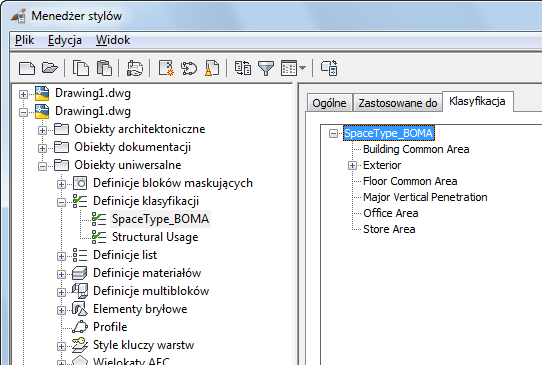 Jeśli norma ma współpracować z klasyfikacjami, należy po utworzeniu zestawu zasobów dla nazw klasyfikacji dodać do normy obiekt typu AecSpaceOffsetClassification. Ta klasa przejmie obsługę wszystkich funkcji związanych z klasyfikacją w normie i w implementacji reguły.