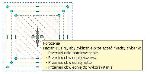 przesunąć obwiednię powierzchni użytkowej pomieszczenia kliknij i przytrzymaj uchwyt położenia, a następnie naciśnij trzy razy klawisz Ctrl, aby przejść do trybu przesuwania obwiedni powierzchni użytkowej. Następnie przesuń obwiednię powierzchni użytkowej w odpowiednie miejsce i kliknij, aby ją zwolnić.