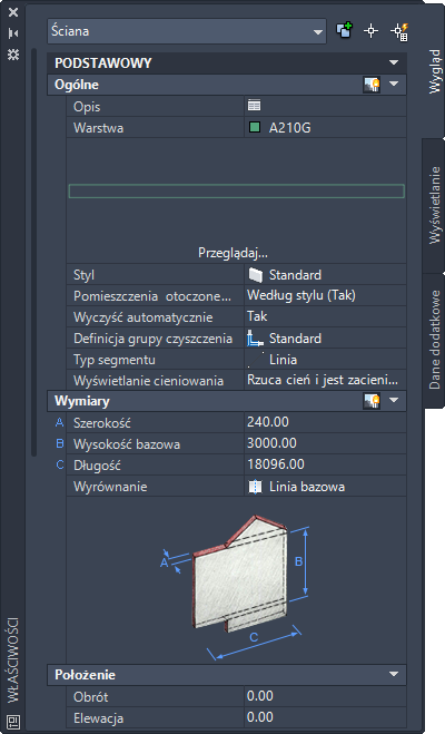 Paleta właściwości udostępnia położenie centralne umożliwiające wyświetlanie i modyfikowanie fizycznych i graficznych właściwości obiektu. Może to być obiekt, który dopiero ma zostać narysowany, lub obiekt już wybrany w obszarze rysunku. Używając karty Dane dodatkowe, znajdującej się w palecie właściwości, można również do obiektów dołączać inne rodzaje informacji, takie jak klasyfikacja, uwagi, dokumenty odniesienia, hiperłącza i dane zestawów właściwości. Podczas sesji programu AutoCAD Architecture toolset paleta Właściwości jest zwykle stale otwarta.