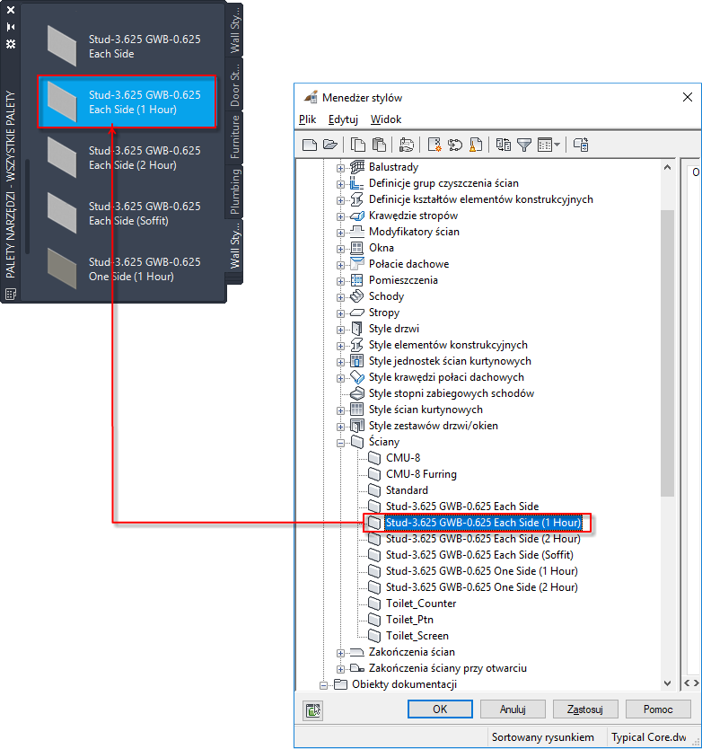 . Jeżeli na przykład chcesz utworzyć narzędzie ściany ze stylem Stud-3.625 GWB-0.625 Each Side (1 Hour), rozwiń opcję Style ścian i wybierz styl Stud-3.625 GWB-0.625 Each Side (1 Hour).