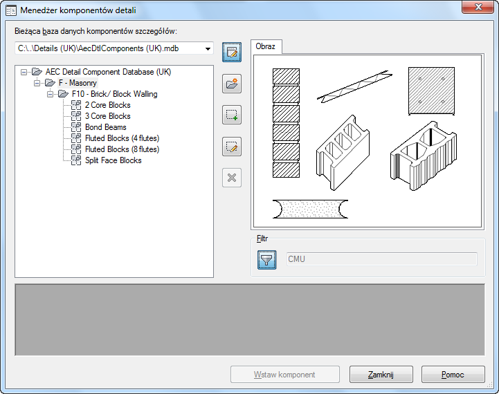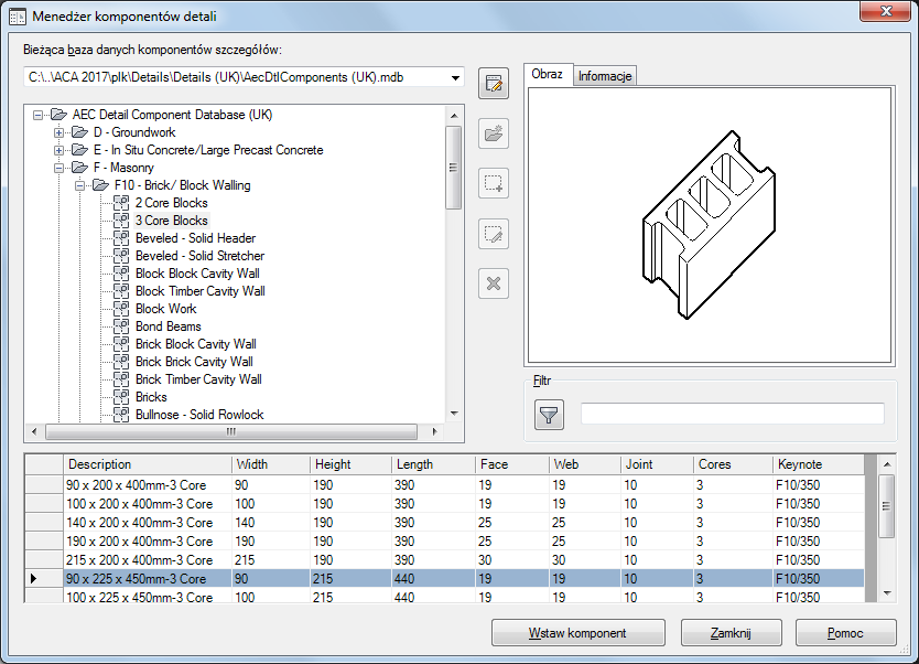 Okno dialogowe Menedżer komponentu szczegółu z wyświetloną tabelą betonowych elementów murarskich