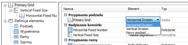 Za pomocą tej procedury można przypisać podział do siatki ściany kurtynowej. W ustawieniach podziału są konfigurowane parametry orientacji siatki (komórki siatki i szprosy mogą być ułożone w kierunku poziomym lub pionowym) oraz rodzaju podziału (liczba i rozmiar komórek).