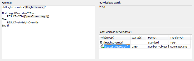 Obiekt pomieszczenia ma pojedynczą wartość numeryczną dla wysokości, która jest taka sama dla większości pomieszczeń w tym zestawieniu pokoi. Aby uzyskać kontrolę nad sposobem wyświetlania wysokości pomieszczeń dla pokoi bez płaskich sufitów, należy utworzyć formułę, która zwraca wartość tekstową, np. „Sklepienie”, dla stropu katedry lub zwraca rzeczywistą wysokość jeżeli nie istnieje. Kompletny arkusz dla takiej formuła jest przedstawiony poniżej.