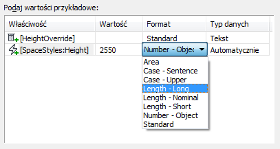 Używanie wielkości w arkuszu definicji właściwości formuły