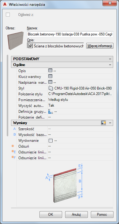 Jedynym stylem opartym na ścianach, który można przypisać do narzędzia na palecie, jest styl ściany. Jednak użycie stylu ściany powoduje automatyczne zaimportowanie wraz z nim wszystkich używanych w nim podstylów, takich jak style zakończeń ścian i style zakończeń ścian przy otwarciach. Przed zapisaniem narzędzia w katalogu niekiedy wskazane jest także zdefiniowanie niektórych domyślnych ustawień: