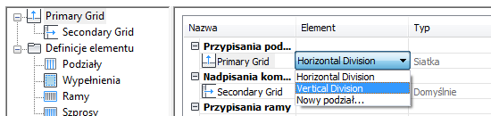 W ustawieniach podziału są konfigurowane parametry orientacji siatki (komórki siatki i szprosy mogą być ułożone w kierunku poziomym lub pionowym) oraz rodzaju podziału (liczba i rozmiar komórek).
