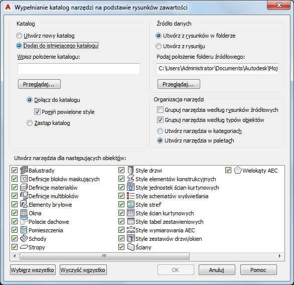 Opcja ta jest także odpowiednia do połączenia stylów z różnych rysunków w katalogu. Otrzymane narzędzia rozmieszczone zostaną w kategoriach lub paletach nazwanych typem stylu, na przykład „Ściany”, „Drzwi” itd.