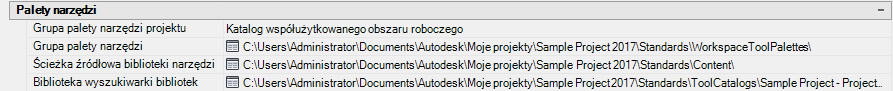 W przypadku wybrania opcji współużytkowanego katalogu obszarów roboczych ścieżka wybrana w obszarze Grupa palet narzędzi jest dodawana do profilu projektu (AWS), a dostęp do katalogu narzędzi uzyskuje się z określonej lokalizacji. W przypadku wybrania opcji katalogu obszaru roboczego użytkownika folder jest tworzony w ścieżce C:\My Documents\Autodesk\My Projects\<nazwa projektu> i do tego folderu są kopiowane palety narzędzi. Jeśli wybrana zostanie opcja Brak, grupa palet narzędzi projektu zostanie wyłączona dla tego projektu, a inne właściwości na paletach narzędzi nie będą wyświetlane.