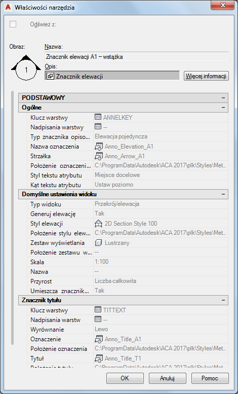 Typ opisu, jego wygląd i inne właściwości charakterystyczne są określane na podstawie edytowanych przez użytkownika wartości arkusza Właściwości narzędzia, który jest dostępny w menu kontekstowym określonego narzędzia.
