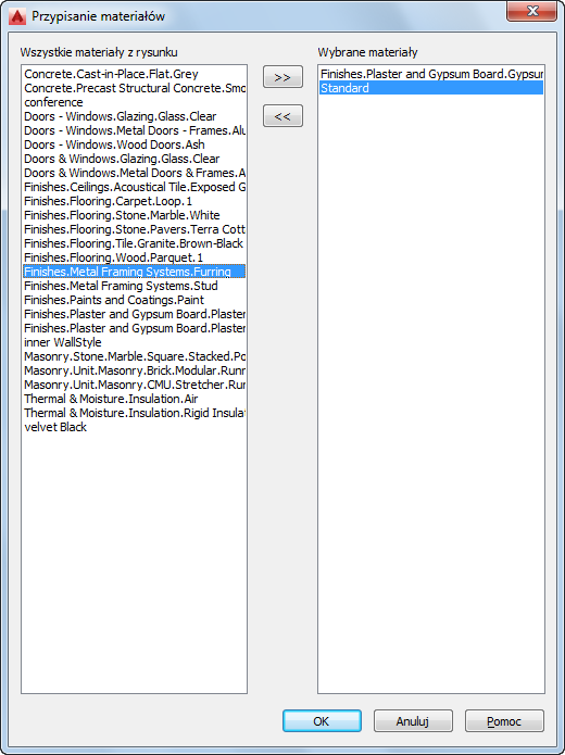 - Umożliwia wyświetlenie listy wszystkich materiałów zdefiniowanych w programie AutoCAD, które są dostępne na rysunku.