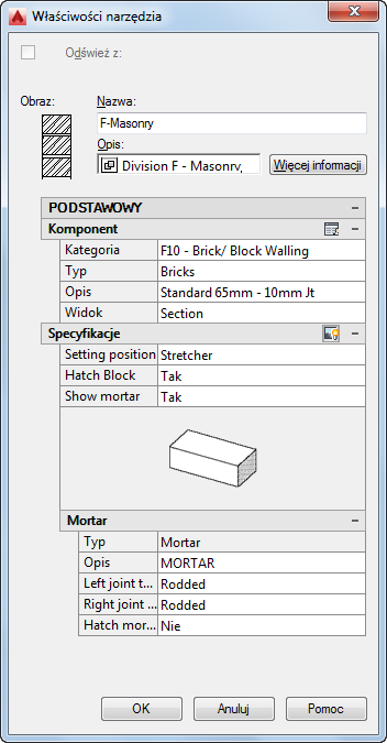 Wygląd arkusza roboczego Właściwości narzędzia zmienia się w zależności od typu komponentu i bieżącej konfiguracji ustawień właściwości. Poniższe rysunki przedstawiają dwie konfiguracje arkusza roboczego Właściwości narzędzia dla narzędzia 04 — Mury, które jest zamieszczone w przykładowej palecie narzędzi podstawowych. Narzędzie jest tak ustawione, aby w obu przypadkach dodawać cegłę ze standardową spoiną 3/8", jednak w przypadku pierwszej konfiguracji właściwość widoku ustawiona została na Przekrój, natomiast w drugim przypadku ustawiono Elewacja (Wzór). W przypadku komponentów detali, które mogą być ustawione w różny sposób w różnych widokach, ustawienie widoku określa procedurę dla poszczególnych rysunków stosowaną do wstawiania obrazu na rysunku. Należy pamiętać, że różne ustawienia widoku sprawiają, że na arkuszu roboczym kierunek ustawienia rysunków jest różny. Należy również pamiętać, że specyfikacje określone dla muru nie mają zastosowania w przypadku ustawienia Elewacja (Wzór) i nie są wyświetlane dla tej konfiguracji. Właściwości wyświetlane dla opcji Specyfikacje mogą również zmieniać się w zależności od innych ustawień. Na przykład jeżeli dla właściwości pokazywania zaprawy wybrano Nie przy ustawieniu Przekrój dla opcji Widok, nie będą wyświetlane inne właściwości muru. W przypadku niektórych komponentów detali specyfikacje nie mają zastosowania i nagłówek nie jest wyświetlany.