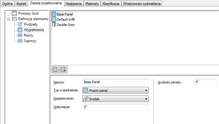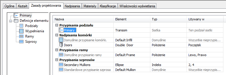 Definicje elementów można modyfikować za pomocą opcji dostępnych na karcie Zasady projektowania znajdującej się w oknie dialogowym właściwości stylu zestawu drzwi/okien. Dostęp do definicji można uzyskać za pośrednictwem listy przypisań i listy definicji: