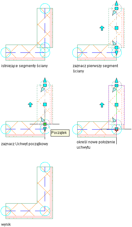 Linie wyrównywania ścian nie przecinają się wzajemnie lub jedna z linii wyrównywania znajduje się poza przylegającym okręgiem czyszczenia. Dopasuj długość jednego segmentu ściany, tak aby koniec linii wyrównywania znajdował się w okręgu czyszczenia przylegającego segmentu ściany.