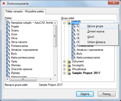 Wskazówka: Okno dialogowe Dostosuj może być bardzo użyteczne podczas dodawania palet do grup palet projektu.