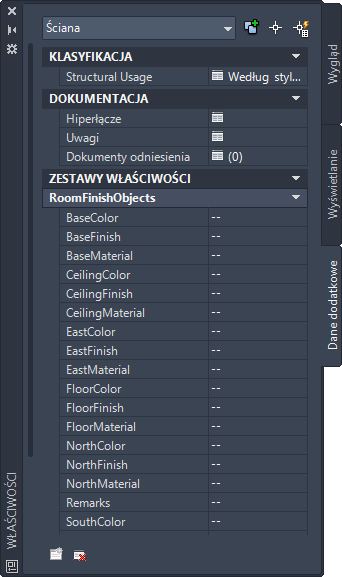 Uwaga: Listą definicji zestawu właściwości na karcie Dane dodatkowe można sterować za pomocą opcji menu rozwijanego Nadpisanie właściwości na karcie Ustawienia obiektu AEC w oknie dialogowym Opcje.