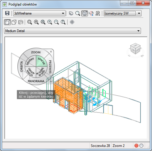 Menu SteeringWheels pomagają zaoszczędzić czas i liczbę kliknięć, łącząc wiele wspólnych narzędzi nawigacyjnych w jednym interfejsie. Koła sterujące są dostosowane do kontekstu, w którym jest wyświetlany model.