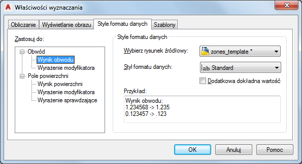 Wartości pola powierzchni lub obwodu będą wówczas wyświetlane z precyzją ustawioną w stylu formatu danych i w dodatkowej kolumnie z dokładną precyzją bez zaokrąglania.