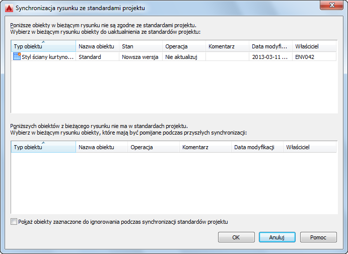 W takiej sytuacji niezestandaryzowany obiekt nie będzie ponownie wyświetlany podczas kolejnych synchronizacji, chyba że zostanie zaznaczona opcja Pokaż obiekty zaznaczone do ignorowania podczas synchronizacji standardów projektu lub zostanie usunięty znacznik Ignoruj z ustawienia stylu lub wyświetlania w Menedżerze stylów lub Menedżerze wyświetlania, patrz opis procedury „Aby wykluczyć style i ustawienia wyświetlania z synchronizacji”.