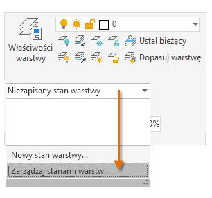 Bieżące ustawienia warstwy można zapisać jako stan warstw, który można później przywrócić lub zaimportować do innych rysunków. Stan warstw jest podobny do zdjęcia istniejących warstw i ustawień warstw zrobionego w czasie tworzenia stanu warstw.