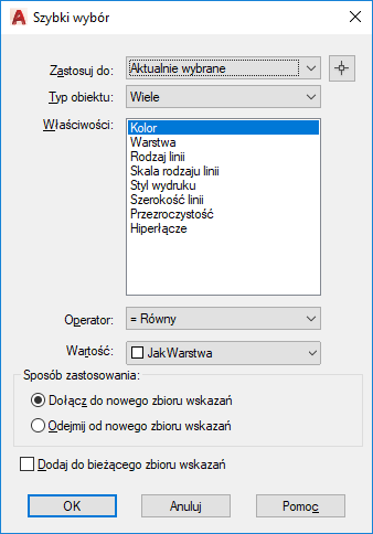 Stosuje kryteria filtrowania do całego rysunku lub do bieżącego zbioru wskazań (jeśli istnieje).
