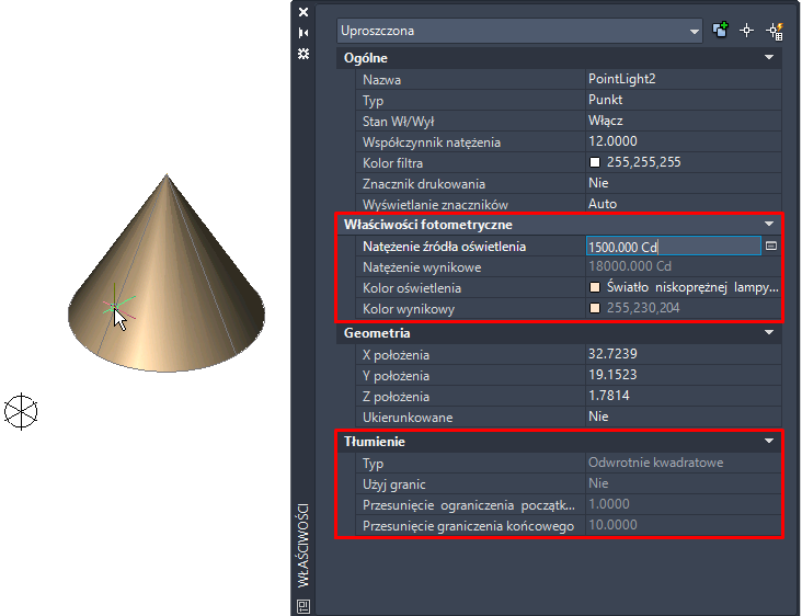 Poniższy obraz to przykład fotometrycznego światła punktowego z wyróżnionymi właściwościami fotometrycznymi na palecie Właściwości:
