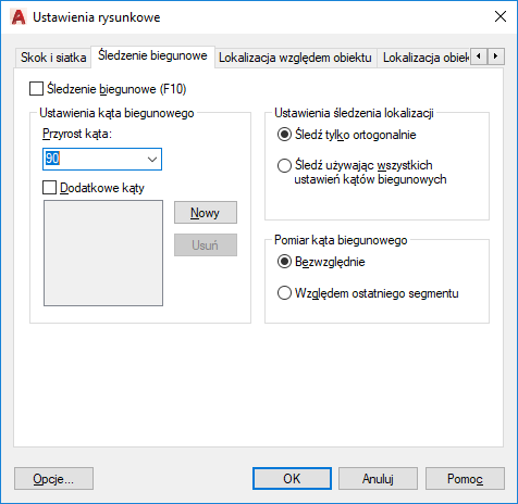 Ogranicza ruch kursora do określonych kątów biegunowych. (zmienna systemowa AUTOSNAP)