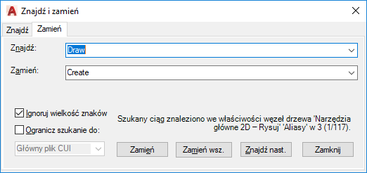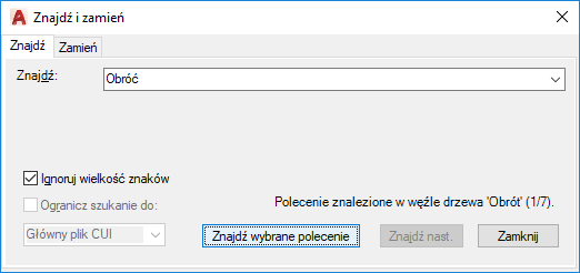 Zostanie wyświetlony komunikat, który określa lokalizację polecenia, jego dokładne położenie w panelu Dostosowywanie w lub panelu Właściwości oraz liczbę jego wystąpień.