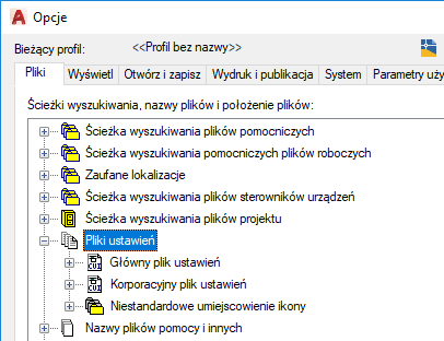 - W oknie dialogowym Opcje, na karcie Pliki kliknij znak plus (+) obok pola Pliki ustawień, aby rozwinąć listę.