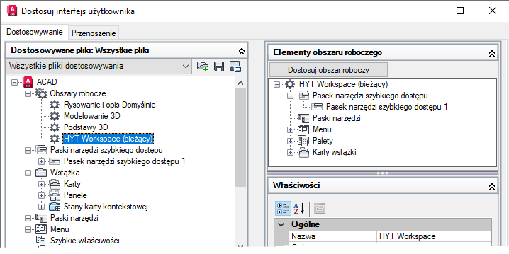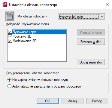 Obszar roboczy służy do przechowywania bieżącego stanu interfejsu użytkownika aplikacji AutoCAD.