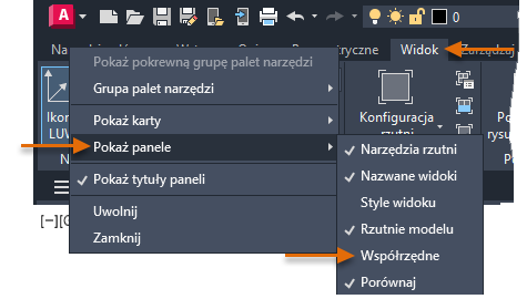 W tym ćwiczeniu zostaną ukryte karty wstążki Parametryczne i zostanie wyświetlony panel Współrzędne na karcie Widok.