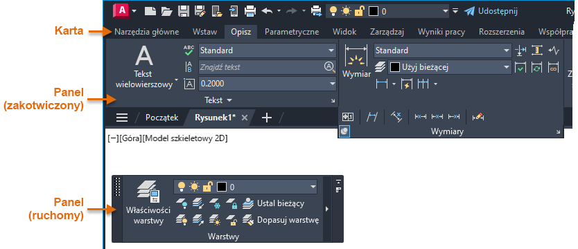 Panele na karcie wstążki można uwalniać w oknie aplikacji. Uwolniony panel wstążki pozostaje widoczny bez względu na to, która karta wstążki jest aktywna. To przydatna funkcja w przypadku częstego przełączania między kilkoma różnymi typami narzędzi. Można na przykład uwolnić panele Warstwy i Właściwości, tak aby były one widoczne nawet przy aktywnych kartach Wstaw lub Opis.